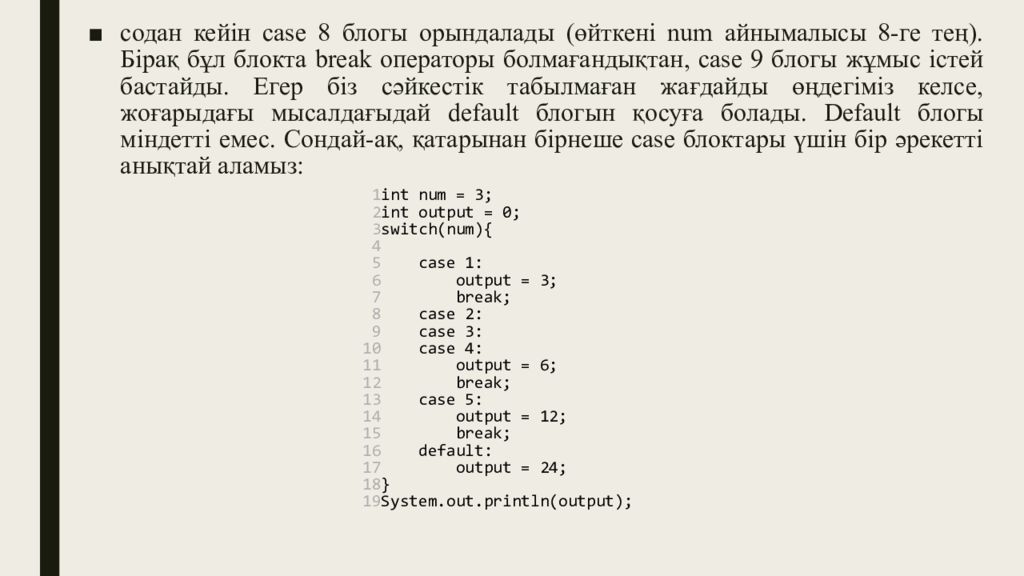 содан кейін case 8 блогы орындалады ( өйткені num айнымалысы 8-ге тең ). Бірақ бұл блокта break операторы болмағандықтан, case 9 блогы жұмыс істей бастайды. Егер біз сәйкестік табылмаған жағдайды өңдегіміз келсе, жоғарыдағы мысалдағыдай default блогын қосуға болады. Default блогы міндетті емес. Сондай-ақ, қатарынан бірнеше case блоктары үшін бір әрекетті анықтай аламыз : 1 2 3 4 5 6 7 8 9 10 11 12 13 14 15 16 17 18 19 int num = 3; int output = 0; switch( num ){ case 1: output = 3; break; case 2: case 3: case 4: output = 6; break; case 5: output = 12; break; default: output = 24; } System.out.println (output);