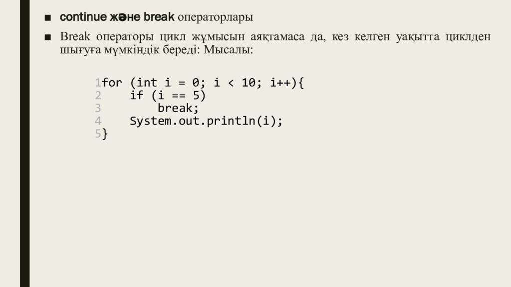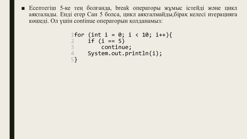 continue және break операторлары Break операторы цикл жұмысын аяқтамаса да, кез келген уақытта циклден шығуға мүмкіндік береді : Мысалы : 1 2 3 4 5 for (int i = 0; i < 10; i++){ if (i == 5) break; System.out.println(i); }
