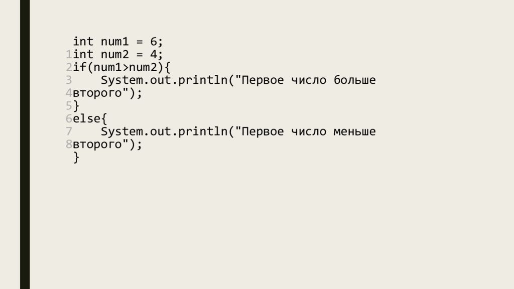 1 2 3 4 5 6 7 8 int num1 = 6; int num2 = 4; if(num1>num2){ System.out.println (" Первое число больше второго"); } else{ System.out.println (" Первое число меньше второго"); }