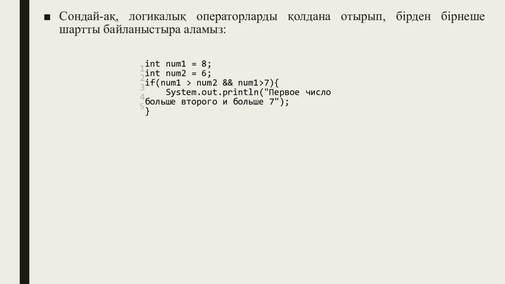 Сондай-ақ, логикалық операторларды қолдана отырып, бірден бірнеше шартты байланыстыра аламыз : 1 2 3 4 5 int num1 = 8; int num2 = 6; if(num1 > num2 && num1>7){ System.out.println (" Первое число больше второго и больше 7"); }