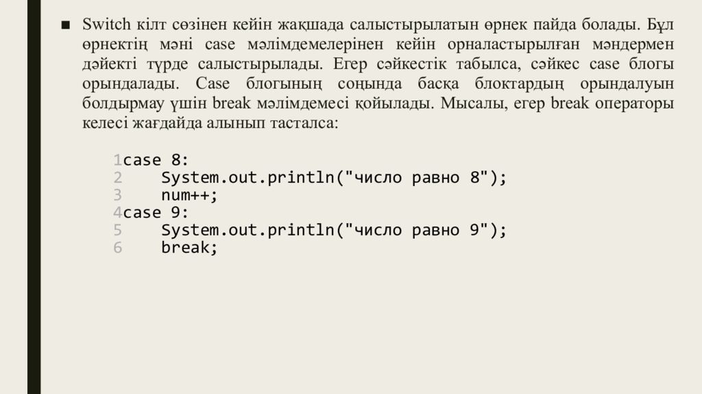 Switch кілт сөзінен кейін жақшада салыстырылатын өрнек пайда болады. Бұл өрнектің мәні case мәлімдемелерінен кейін орналастырылған мәндермен дәйекті түрде салыстырылады. Егер сәйкестік табылса, сәйкес case блогы орындалады. Case блогының соңында басқа блоктардың орындалуын болдырмау үшін break мәлімдемесі қойылады. Мысалы, егер break операторы келесі жағдайда алынып тасталса : 1 2 3 4 5 6 case 8: System.out.println (" число равно 8"); num ++; case 9: System.out.println (" число равно 9"); break;