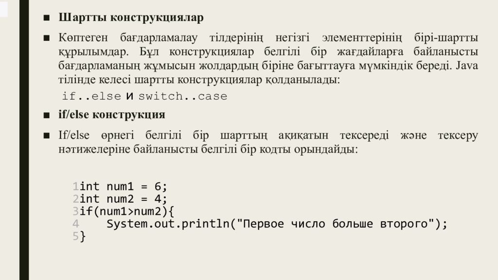 Шартты конструкциялар Көптеген бағдарламалау тілдерінің негізгі элементтерінің бірі-шартты құрылымдар. Бұл конструкциялар белгілі бір жағдайларға байланысты бағдарламаның жұмысын жолдардың біріне бағыттауға мүмкіндік береді. Java тілінде келесі шартты конструкциялар қолданылады : if.. else и switch.. case if/else к онструкция If/else өрнегі белгілі бір шарттың ақиқатын тексереді және тексеру нәтижелеріне байланысты белгілі бір кодты орындайды : 1 2 3 4 5 int num1 = 6; int num2 = 4; if(num1>num2){ System.out.println (" Первое число больше второго"); }