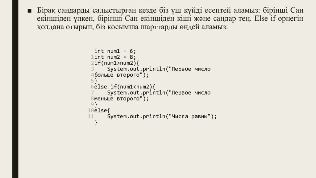 Бірақ сандарды салыстырған кезде біз үш күйді есептей аламыз : бірінші Сан екіншіден үлкен, бірінші Сан екіншіден кіші және сандар тең. Else if өрнегін қолдана отырып, біз қосымша шарттарды өңдей аламыз : 1 2 3 4 5 6 7 8 9 10 11 int num1 = 6; int num2 = 8; if(num1>num2){ System.out.println (" Первое число больше второго"); } else if(num1<num2){ System.out.println (" Первое число меньше второго"); } else{ System.out.println (" Числа равны"); }