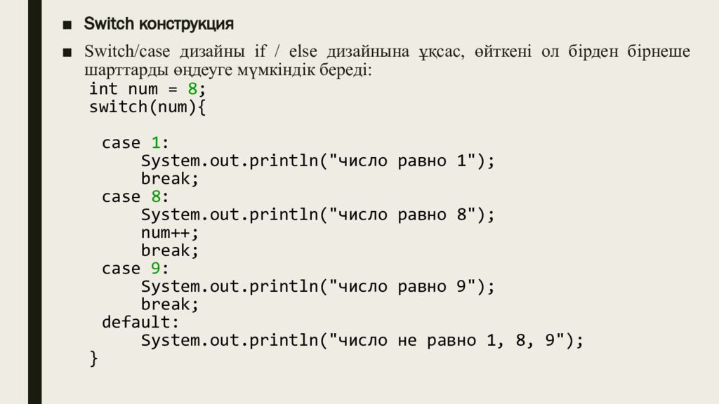 Switch к онструкция Switch/case дизайны if / else дизайнына ұқсас, өйткені ол бірден бірнеше шарттарды өңдеуге мүмкіндік береді : int num = 8 ; switch ( num ){ case 1 : System.out.println ("число равно 1"); break ; case 8 : System.out.println ("число равно 8"); num ++; break ; case 9 : System.out.println ("число равно 9"); break ; default : System.out.println ("число не равно 1, 8, 9"); }