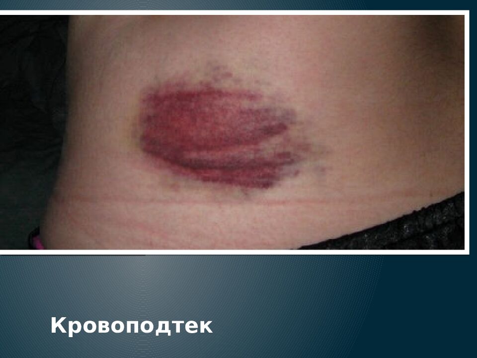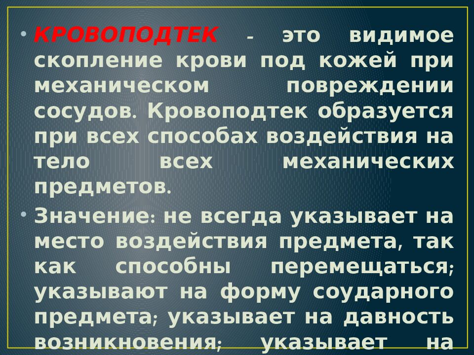 КРОВОПОДТЕК - это видимое скопление крови под кожей при механическом повреждении сосудов. Кровоподтек образуется при всех способах воздействия на тело всех механических предметов. Значение: не всегда указывает на место воздействия предмета, так как способны перемещаться; указывают на форму соударного предмета; указывает на давность возникновения; указывает на прижизненность (у мертвого не образуются).