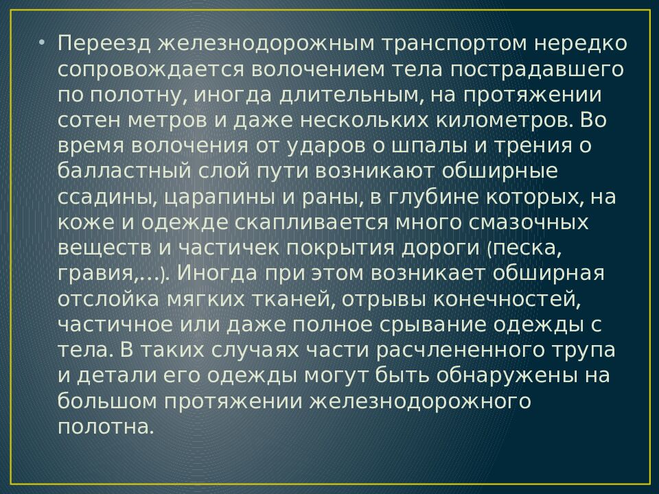 Переезд железнодорожным транспортом нередко сопровождается волочением тела пострадавшего по полотну, иногда длительным, на протяжении сотен метров и даже нескольких километров. Во время волочения от ударов о шпалы и трения о балластный слой пути возникают обширные ссадины, царапины и раны, в глубине которых, на коже и одежде скапливается много смазочных веществ и частичек покрытия дороги (песка, гравия,…). Иногда при этом возникает обширная отслойка мягких тканей, отрывы конечностей, частичное или даже полное срывание одежды с тела. В таких случаях части расчлененного трупа и детали его одежды могут быть обнаружены на большом протяжении железнодорожного полотна.