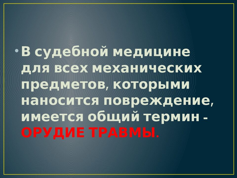 В судебной медицине для всех механических предметов, которыми наносится повреждение, имеется общий термин - ОРУДИЕ ТРАВМЫ.