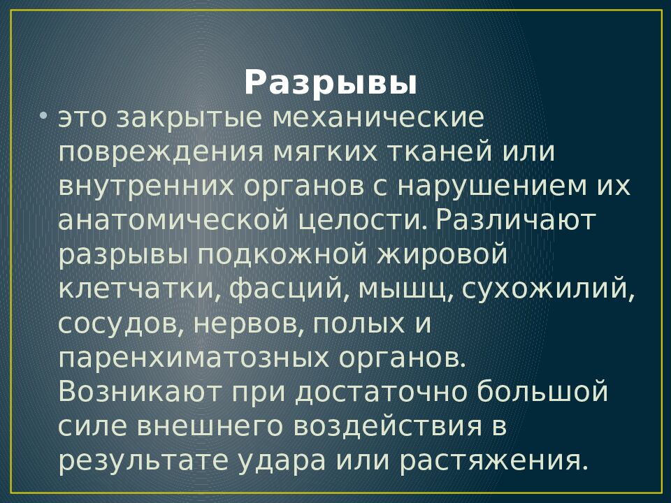 это закрытые механические повреждения мягких тканей или внутренних органов с нарушением их анатомической целости. Различают разрывы подкожной жировой клетчатки, фасций, мышц, сухожилий, сосудов, нервов, полых и паренхиматозных органов. Возникают при достаточно большой силе внешнего воздействия в результате удара или растяжения.