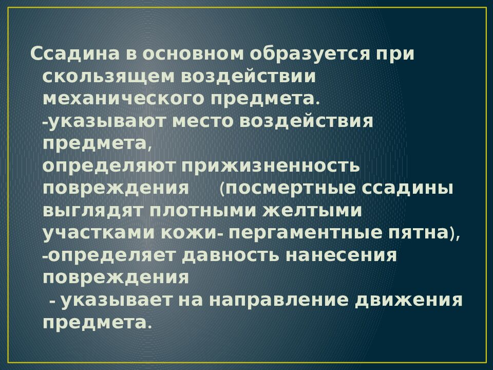 Ссадина в основном образуется при скользящем воздействии механического предмета. -указывают место воздействия предмета, определяют прижизненность повреждения (посмертные ссадины выглядят плотными желтыми участками кожи- пергаментные пятна), -определяет давность нанесения повреждения - указывает на направление движения предмета.