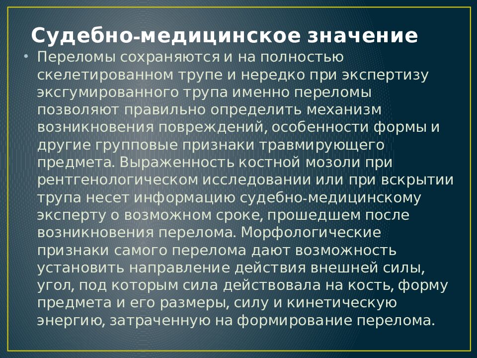 Переломы сохраняются и на полностью скелетированном трупе и нередко при экспертизу эксгумированного трупа именно переломы позволяют правильно определить механизм возникновения повреждений, особенности формы и другие групповые признаки травмирующего предмета. Выраженность костной мозоли при рентгенологическом исследовании или при вскрытии трупа несет информацию судебно-медицинскому эксперту о возможном сроке, прошедшем после возникновения перелома. Морфологические признаки самого перелома дают возможность установить направление действия внешней силы, угол, под которым сила действовала на кость, форму предмета и его размеры, силу и кинетическую энергию, затраченную на формирование перелома.