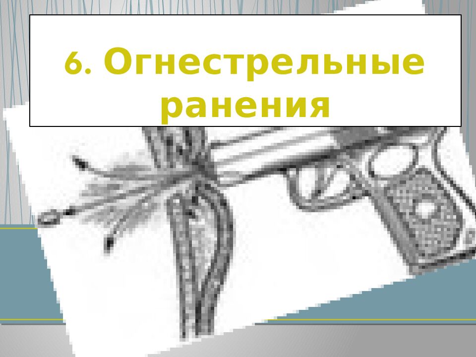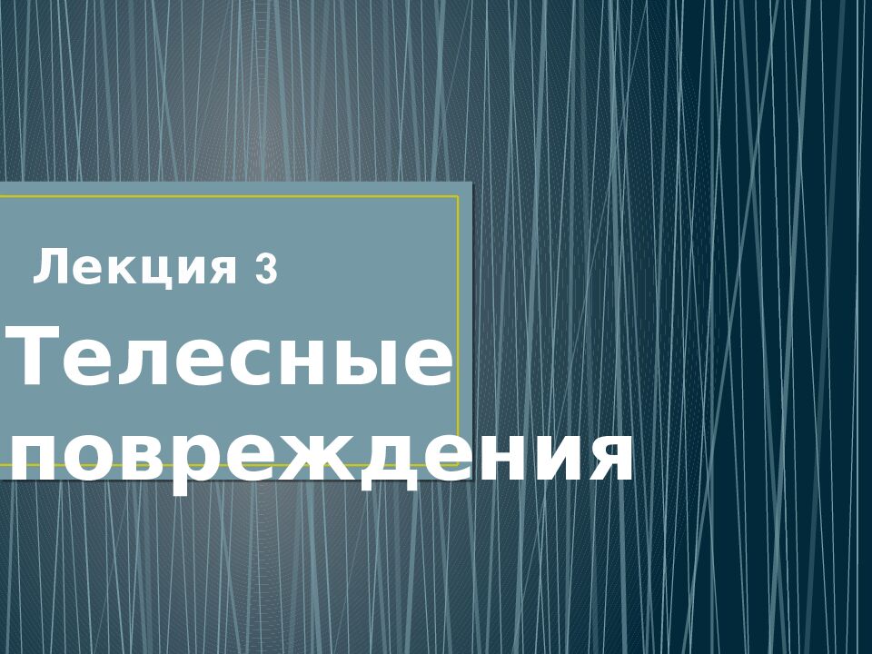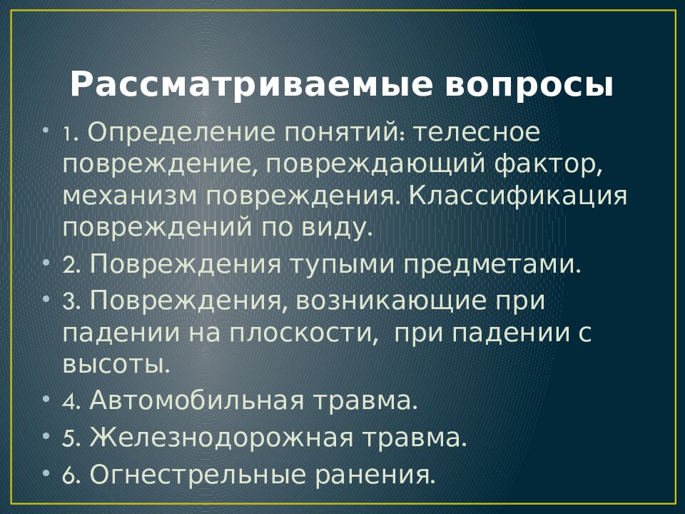 1. Определение понятий: телесное повреждение, повреждающий фактор, механизм повреждения. Классификация повреждений по виду. 2. Повреждения тупыми предметами. 3. Повреждения, возникающие при падении на плоскости, при падении с высоты. 4. Автомобильная травма. 5. Железнодорожная травма. 6. Огнестрельные ранения.