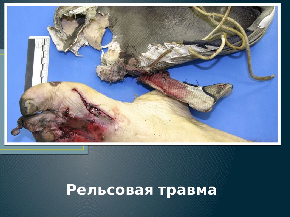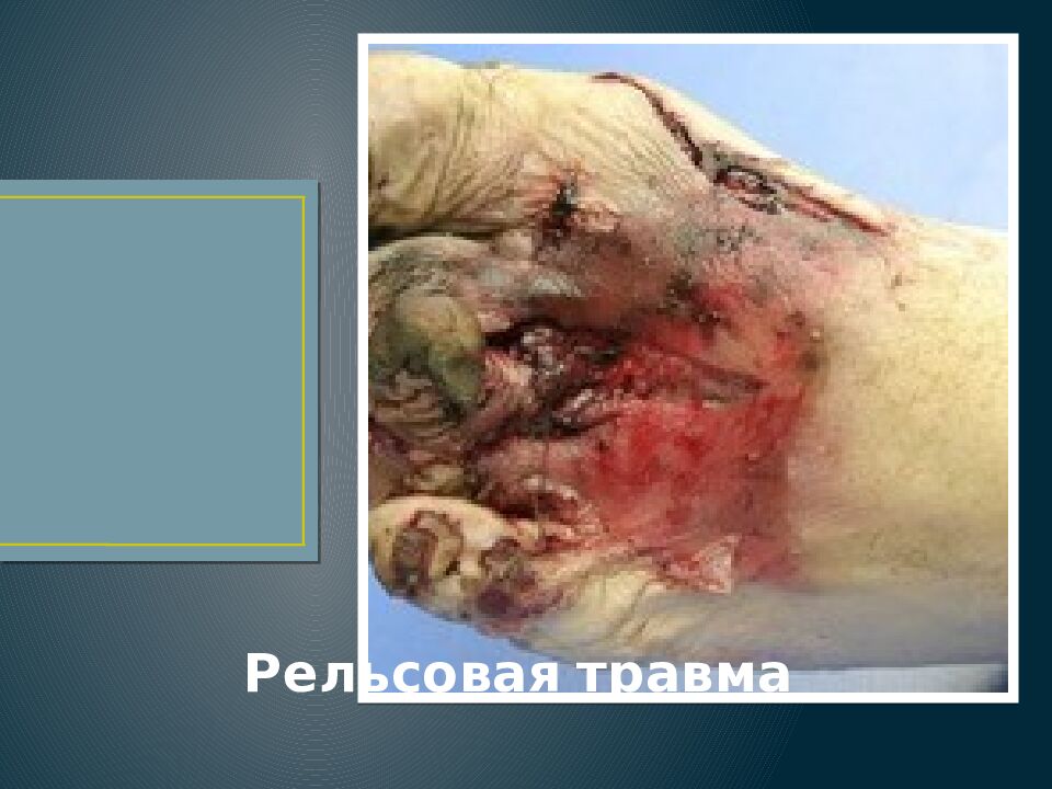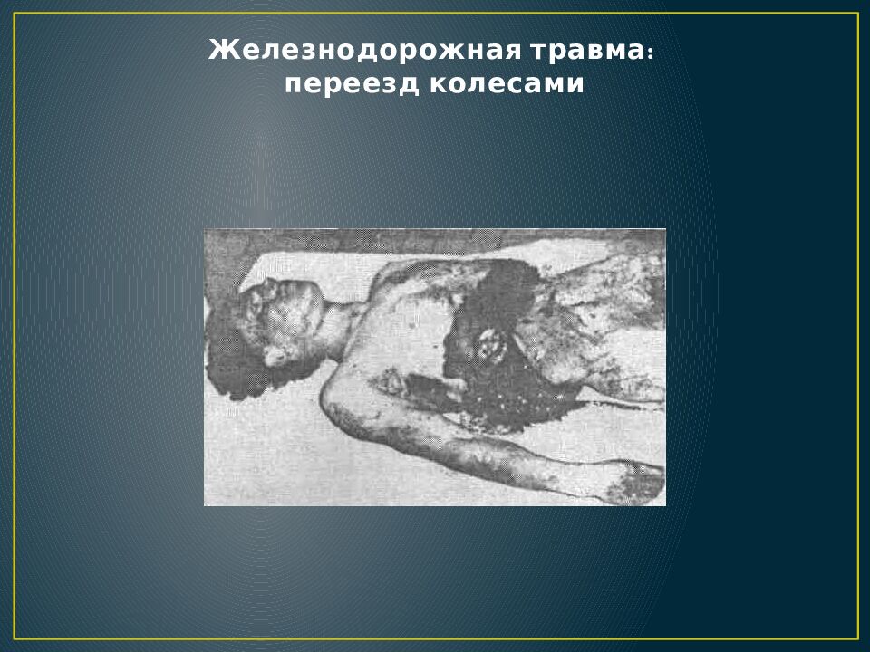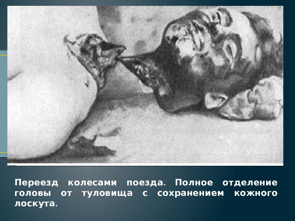 Слайд 61: Переезд колесами поезда. Полное отделение головы от туловища с сохранением кожного лоскута
