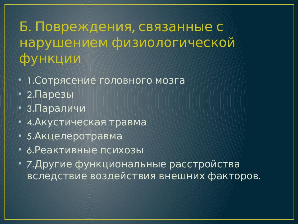 1.Сотрясение головного мозга 2.Парезы 3.Параличи 4.Акустическая травма 5.Акцелеротравма 6.Реактивные психозы 7.Другие функциональные расстройства вследствие воздействия внешних факторов. Б. Повреждения, связанные с нарушением физиологической функции