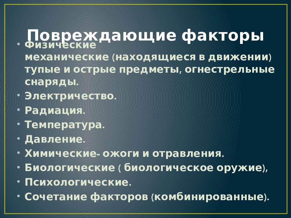Физические механические (находящиеся в движении) тупые и острые предметы, огнестрельные снаряды. Электричество. Радиация. Температура. Давление. Химические- ожоги и отравления. Биологические ( биологическое оружие), Психологические. Сочетание факторов (комбинированные).