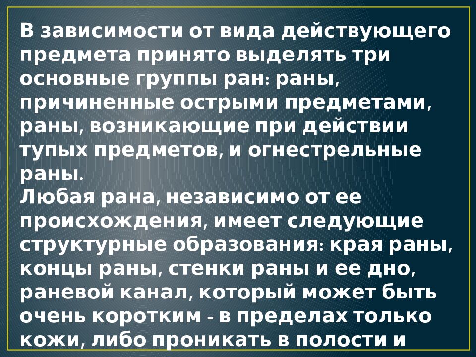 В зависимости от вида действующего предмета принято выделять три основные группы ран: раны, причиненные острыми предметами, раны, возникающие при действии тупых предметов, и огнестрельные раны. Любая рана, независимо от ее происхождения, имеет следующие структурные образования: края раны, концы раны, стенки раны и ее дно, раневой канал, который может быть очень коротким - в пределах только кожи, либо проникать в полости и внутренние органы.