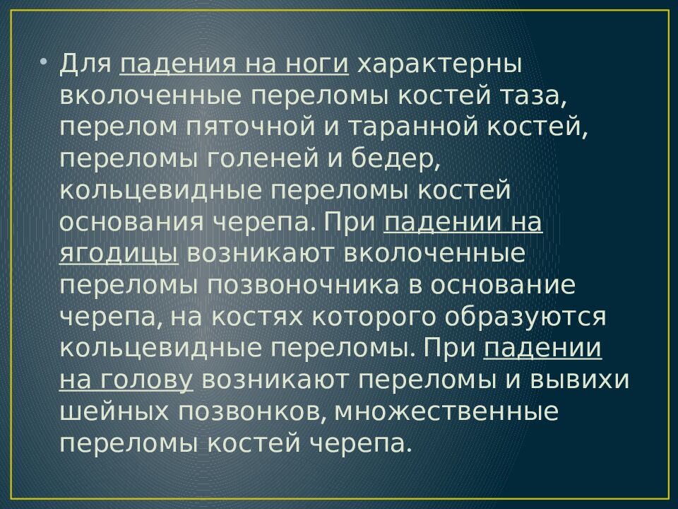 Для падения на ноги характерны вколоченные переломы костей таза, перелом пяточной и таранной костей, переломы голеней и бедер, кольцевидные переломы костей основания черепа. При падении на ягодицы возникают вколоченные переломы позвоночника в основание черепа, на костях которого образуются кольцевидные переломы. При падении на голову возникают переломы и вывихи шейных позвонков, множественные переломы костей черепа.