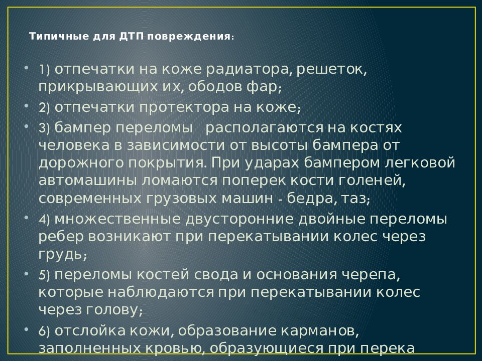 1) отпечатки на коже радиатора, решеток, прикрывающих их, ободов фар; 2) отпечатки протектора на коже; 3) бампер переломы располагаются на костях человека в зависимости от высоты бампера от дорожного покрытия. При ударах бампером легковой автомашины ломаются поперек кости голеней, современных грузовых машин - бедра, таз; 4) множественные двусторонние двойные переломы ребер возникают при перекатывании колес через грудь; 5) переломы костей свода и основания черепа, которые наблюдаются при перекатывании колес через голову; 6) отслойка кожи, образование карманов, заполненных кровью, образующиеся при перекатывании колес через грудь, спину, конечности.