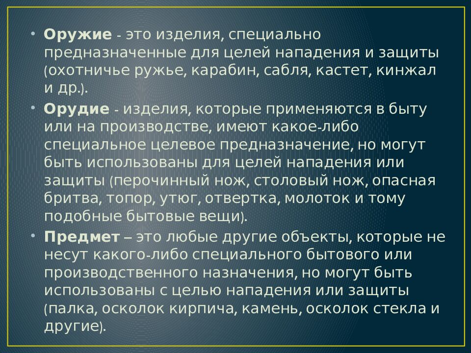 Оружие - это изделия, специально предназначенные для целей нападения и защиты (охотничье ружье, карабин, сабля, кастет, кинжал и др.). Орудие - изделия, которые применяются в быту или на производстве, имеют какое-либо специальное целевое предназначение, но могут быть использованы для целей нападения или защиты (перочинный нож, столовый нож, опасная бритва, топор, утюг, отвертка, молоток и тому подобные бытовые вещи). Предмет – это любые другие объекты, которые не несут какого-либо специального бытового или производственного назначения, но могут быть использованы с целью нападения или защиты (палка, осколок кирпича, камень, осколок стекла и другие).