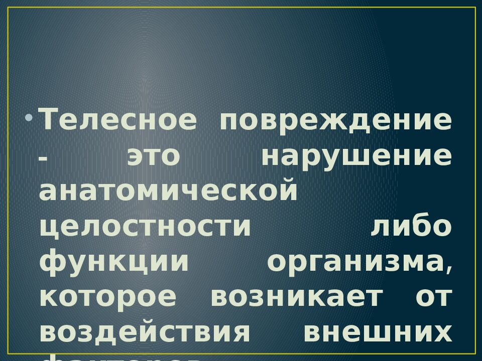 Телесное повреждение - это нарушение анатомической целостности либо функции организма, которое возникает от воздействия внешних факторов.