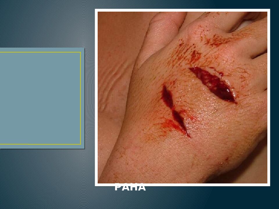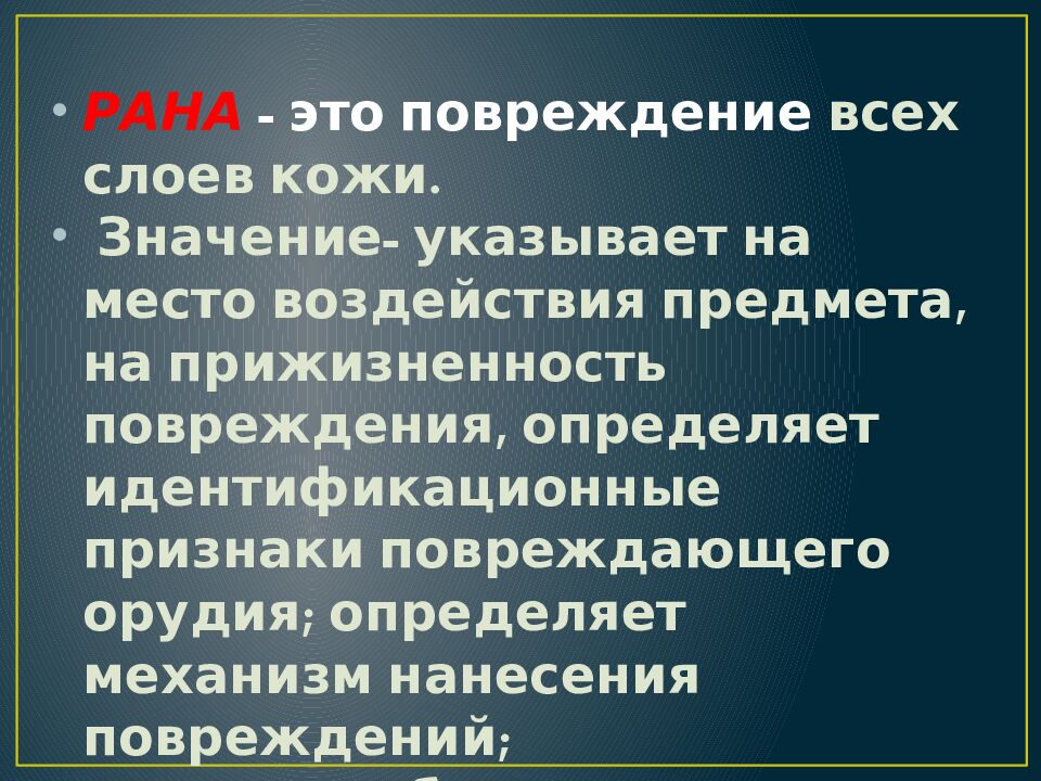 РАНА - это повреждение всех слоев кожи. Значение- указывает на место воздействия предмета, на прижизненность повреждения, определяет идентификационные признаки повреждающего орудия; определяет механизм нанесения повреждений; давность образования раны.