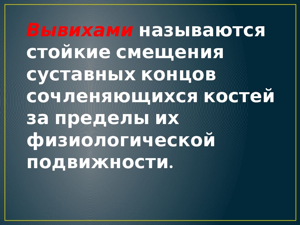 Вывихами называются стойкие смещения суставных концов сочленяющихся костей за пределы их физиологической подвижности.