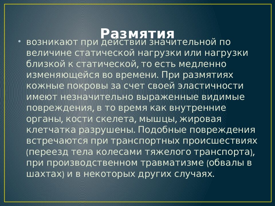 возникают при действии значительной по величине статической нагрузки или нагрузки близкой к статической, то есть медленно изменяющейся во времени. При размятиях кожные покровы за счет своей эластичности имеют незначительно выраженные видимые повреждения, в то время как внутренние органы, кости скелета, мышцы, жировая клетчатка разрушены. Подобные повреждения встречаются при транспортных происшествиях (переезд тела колесами тяжелого транспорта), при производственном травматизме (обвалы в шахтах) и в некоторых других случаях.