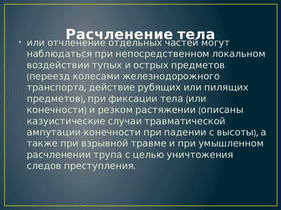 или отчленение отдельных частей могут наблюдаться при непосредственном локальном воздействии тупых и острых предметов (переезд колесами железнодорожного транспорта, действие рубящих или пилящих предметов), при фиксации тела (или конечности) и резком растяжении (описаны казуистические случаи травматической ампутации конечности при падении с высоты), а также при взрывной травме и при умышленном расчленении трупа с целью уничтожения следов преступления.