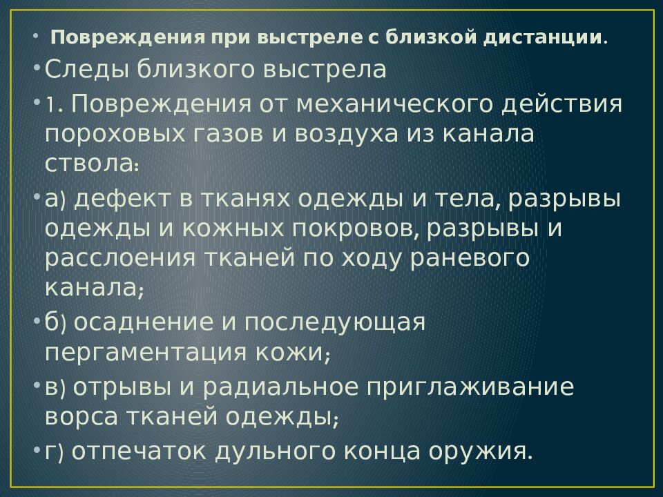 Повреждения при выстреле с близкой дистанции. Следы близкого выстрела 1. Повреждения от механического действия пороховых газов и воздуха из канала ствола: а) дефект в тканях одежды и тела, разрывы одежды и кожных покровов, разрывы и расслоения тканей по ходу раневого канала; б) осаднение и последующая пергаментация кожи; в) отрывы и радиальное приглаживание ворса тканей одежды; г) отпечаток дульного конца оружия.