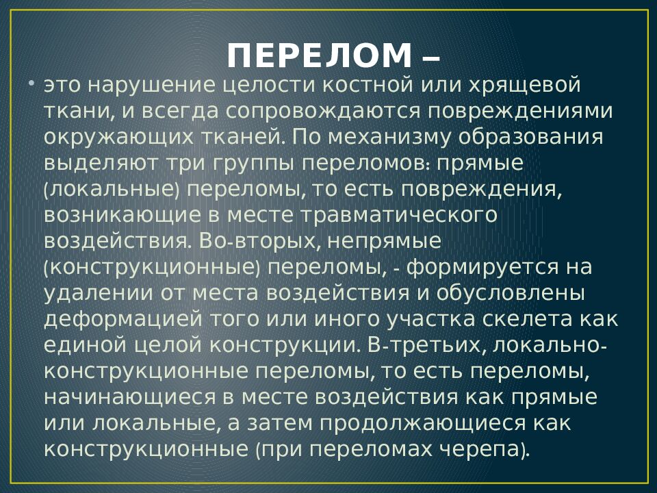 это нарушение целости костной или хрящевой ткани, и всегда сопровождаются повреждениями окружающих тканей. По механизму образования выделяют три группы переломов: прямые (локальные) переломы, то есть повреждения, возникающие в месте травматического воздействия. Во-вторых, непрямые (конструкционные) переломы, - формируется на удалении от места воздействия и обусловлены деформацией того или иного участка скелета как единой целой конструкции. В-третьих, локально-конструкционные переломы, то есть переломы, начинающиеся в месте воздействия как прямые или локальные, а затем продолжающиеся как конструкционные (при переломах черепа).