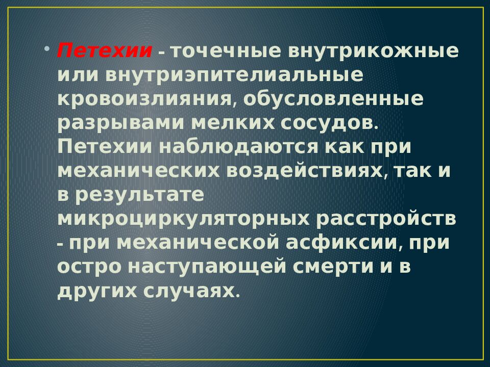 Петехии - точечные внутрикожные или внутриэпителиальные кровоизлияния, обусловленные разрывами мелких сосудов. Петехии наблюдаются как при механических воздействиях, так и в результате микроциркуляторных расстройств - при механической асфиксии, при остро наступающей смерти и в других случаях.