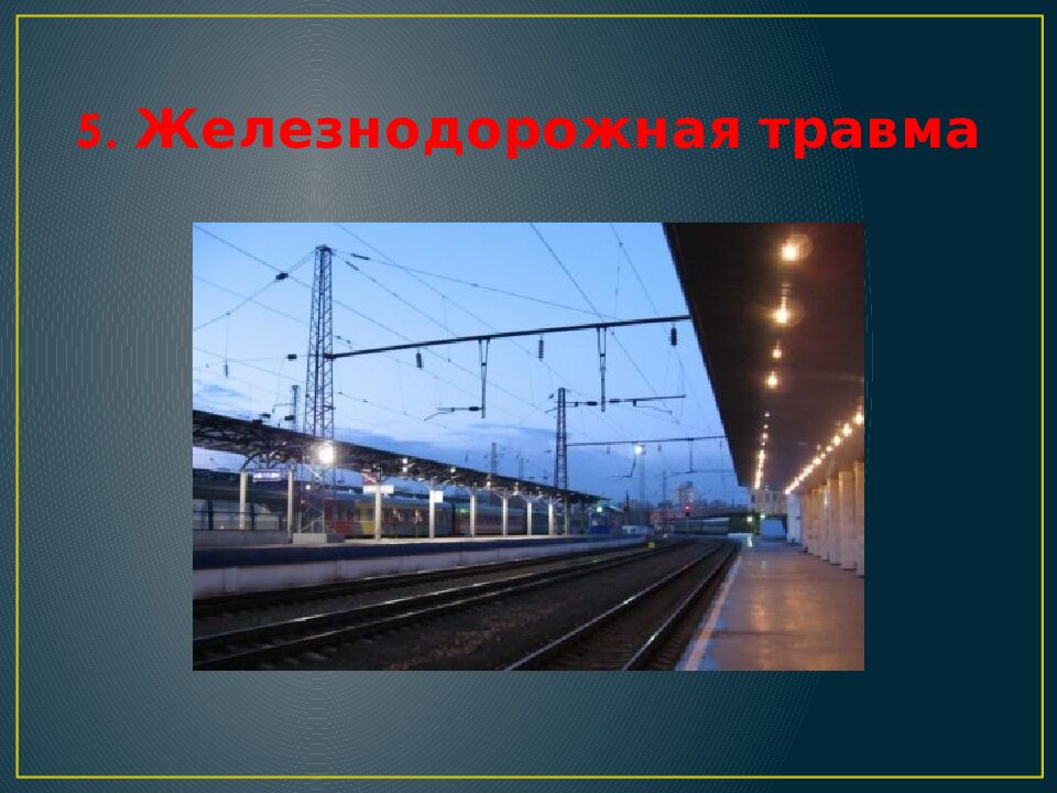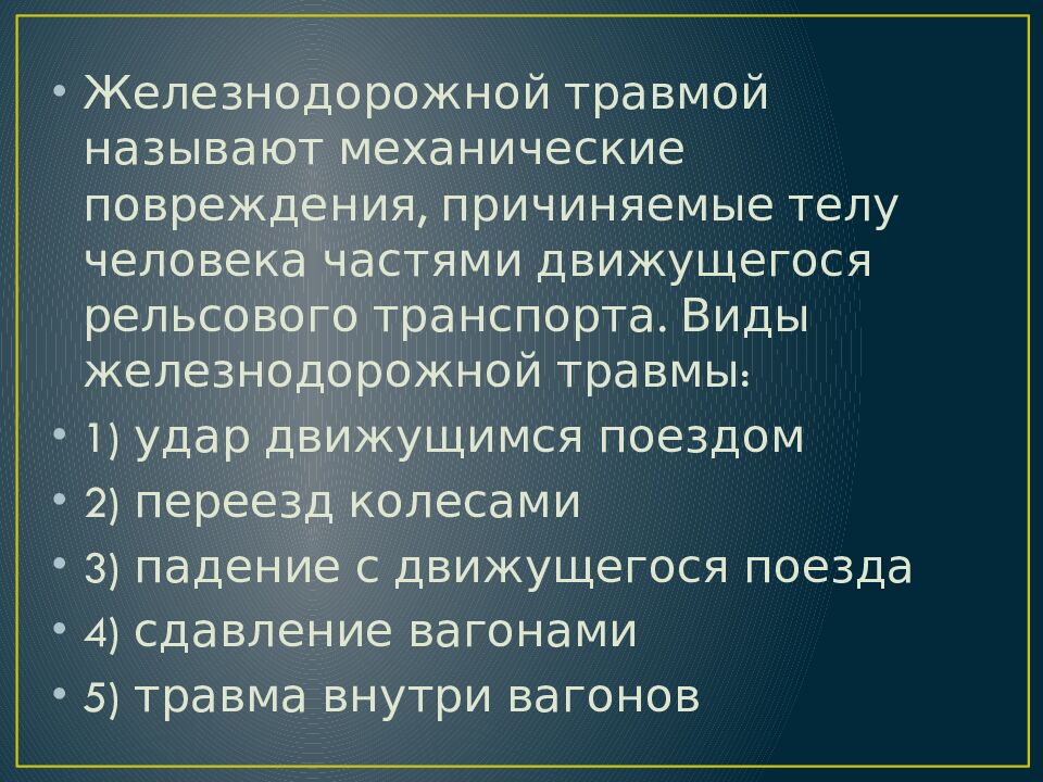 Железнодорожной травмой называют механические повреждения, причиняемые телу человека частями движущегося рельсового транспорта. Виды железнодорожной травмы: 1) удар движущимся поездом 2) переезд колесами 3) падение с движущегося поезда 4) сдавление вагонами 5) травма внутри вагонов