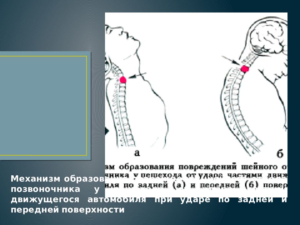 Слайд 54: Механизм образования повреждений шейного отдела позвоночника у пешехода от удара частями движущегося автомобиля при ударе по задней и передней поверхности