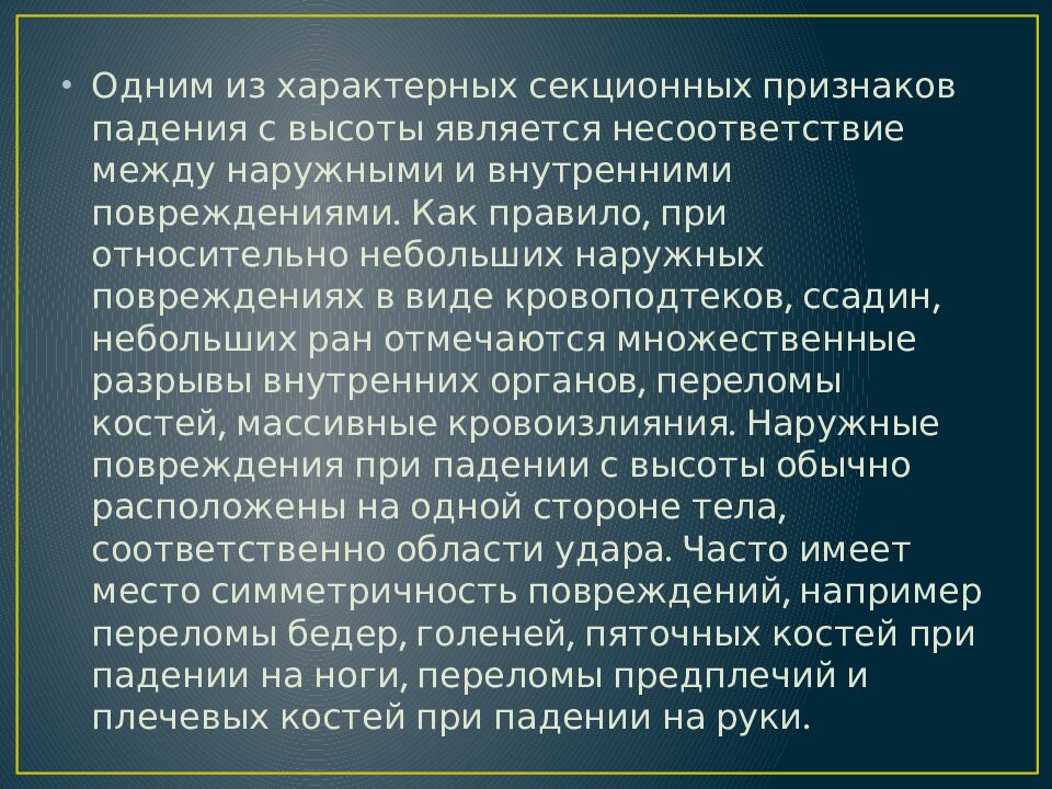 Одним из характерных секционных признаков падения с высоты является несоответствие между наружными и внутренними повреждениями. Как правило, при относительно небольших наружных повреждениях в виде кровоподтеков, ссадин, небольших ран отмечаются множественные разрывы внутренних органов, переломы костей, массивные кровоизлияния. Наружные повреждения при падении с высоты обычно расположены на одной стороне тела, соответственно области удара. Часто имеет место симметричность повреждений, например переломы бедер, голеней, пяточных костей при падении на ноги, переломы предплечий и плечевых костей при падении на руки.
