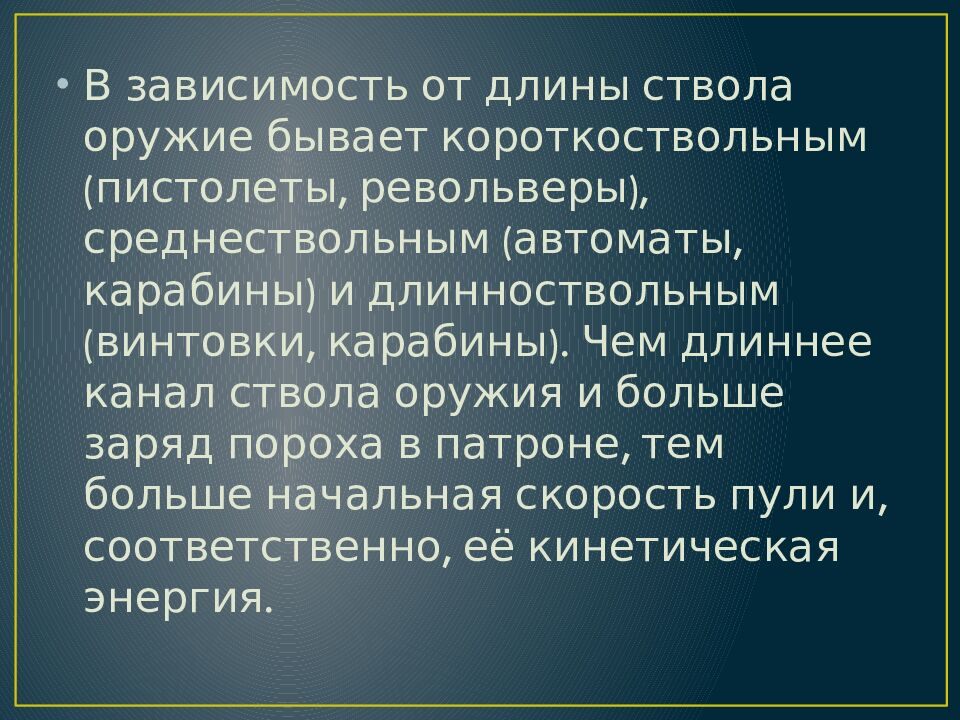 В зависимость от длины ствола оружие бывает короткоствольным (пистолеты, револьверы), среднествольным (автоматы, карабины) и длинноствольным (винтовки, карабины). Чем длиннее канал ствола оружия и больше заряд пороха в патроне, тем больше начальная скорость пули и, соответственно, её кинетическая энергия.