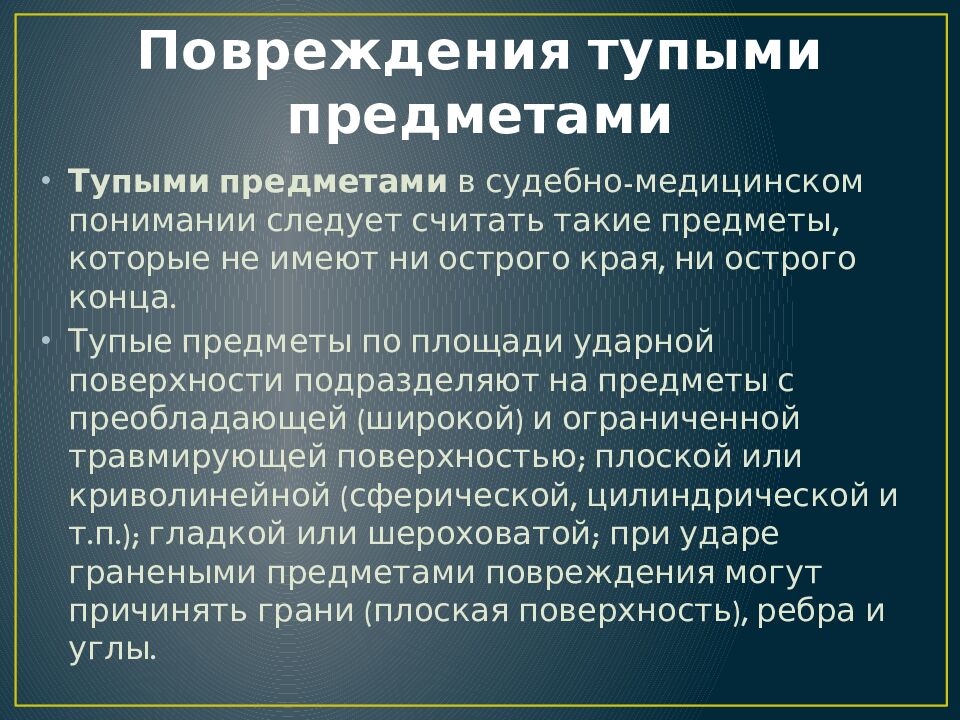 Тупыми предметами в судебно-медицинском понимании следует считать такие предметы, которые не имеют ни острого края, ни острого конца. Тупые предметы по площади ударной поверхности подразделяют на предметы с преобладающей (широкой) и ограниченной травмирующей поверхностью; плоской или криволинейной (сферической, цилиндрической и т.п.); гладкой или шероховатой; при ударе гранеными предметами повреждения могут причинять грани (плоская поверхность), ребра и углы.