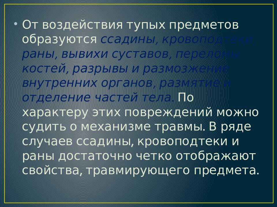 От воздействия тупых предметов образуются ссадины, кровоподтеки, раны, вывихи суставов, переломы костей, разрывы и размозжение внутренних органов, размятие и отделение частей тела. По характеру этих повреждений можно судить о механизме травмы. В ряде случаев ссадины, кровоподтеки и раны достаточно четко отображают свойства, травмирующего предмета.