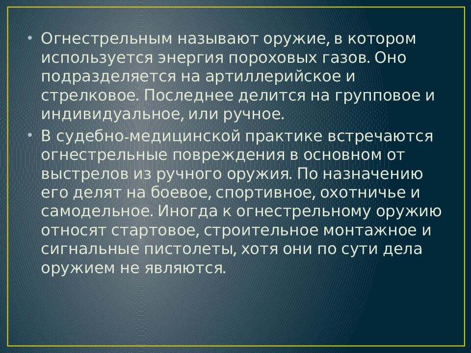 Огнестрельным называют оружие, в котором используется энергия пороховых газов. Оно подразделяется на артиллерийское и стрелковое. Последнее делится на групповое и индивидуальное, или ручное. В судебно-медицинской практике встречаются огнестрельные повреждения в основном от выстрелов из ручного оружия. По назначению его делят на боевое, спортивное, охотничье и самодельное. Иногда к огнестрельному оружию относят стартовое, строительное монтажное и сигнальные пистолеты, хотя они по сути дела оружием не являются.