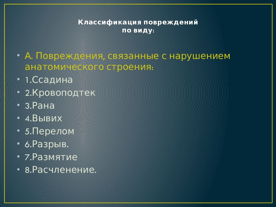 А. Повреждения, связанные с нарушением анатомического строения: 1.Ссадина 2.Кровоподтек 3.Рана 4.Вывих 5.Перелом 6.Разрыв. 7.Размятие 8.Расчленение.