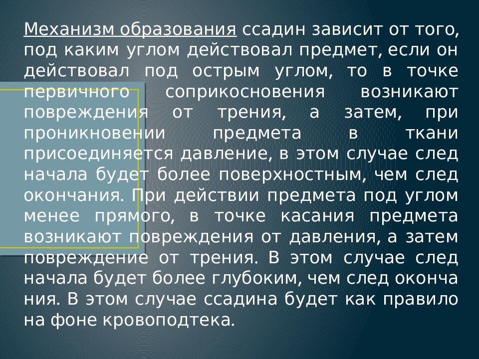 Механизм образования ссадин зависит от того, под каким углом действовал предмет, если он действовал под острым углом, то в точке первичного соприкосновения возникают повреждения от трения, а затем, при проникновении предмета в ткани присоединяется давление, в этом случае след начала будет более поверхностным, чем след окончания. При действии предмета под углом менее прямого, в точке касания предмета возникают повреждения от давления, а затем повреждение от трения. В этом случае след начала будет более глубоким, чем след окончания. В этом случае ссадина будет как правило на фоне кровоподтека.