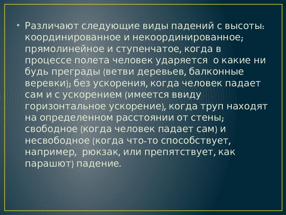 Различают следующие виды падений с высоты: координированное и некоординированное ; прямолинейное и ступенчатое, когда в процессе полета человек ударяется о какие ни будь преграды (ветви деревьев, балконные веревки); без ускорения, когда человек падает сам и с ускорением (имеется ввиду горизонтальное ускорение), когда труп находят на определенном расстоянии от стены; свободное (когда человек падает сам) и несвободное (когда что-то способствует, например, рюкзак, или препятствует, как парашют) падение.