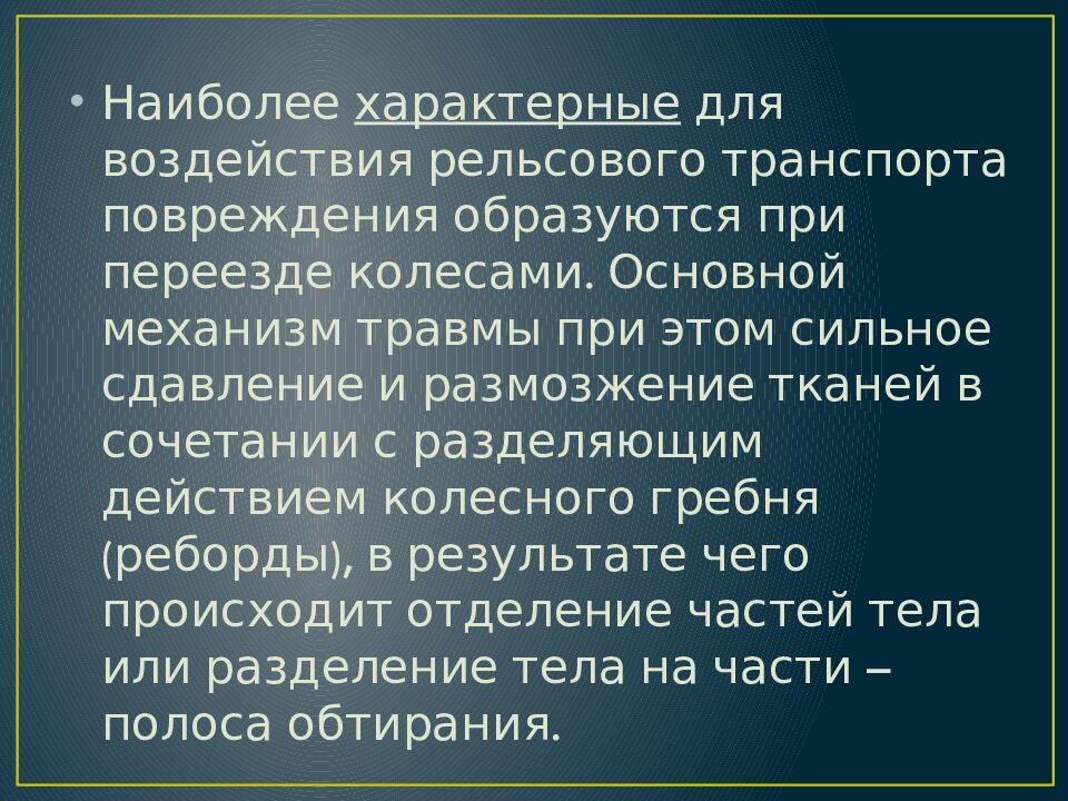 Наиболее характерные для воздействия рельсового транспорта повреждения образуются при переезде колесами. Основной механизм травмы при этом сильное сдавление и размозжение тканей в сочетании с разделяющим действием колесного гребня (реборды), в результате чего происходит отделение частей тела или разделение тела на части – полоса обтирания.