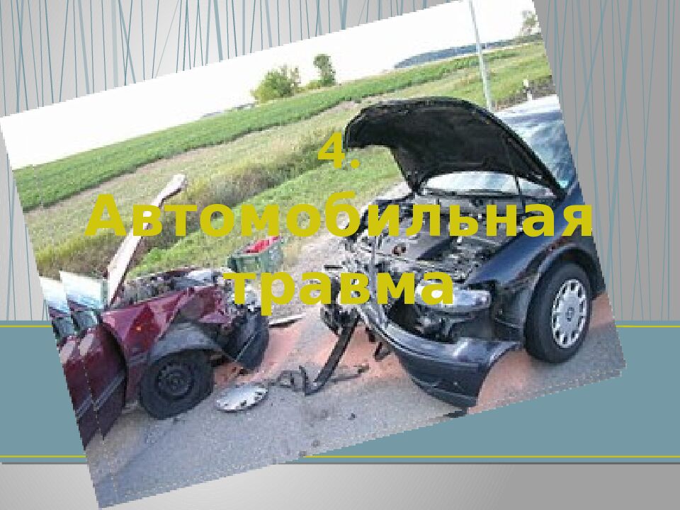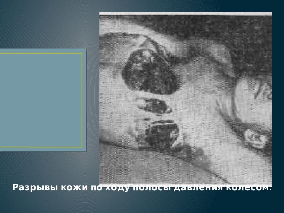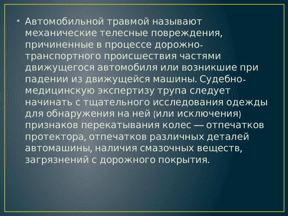 Автомобильной травмой называют механические телесные повреждения, причиненные в процессе дорожно-транспортного происшествия частями движущегося автомобиля или возникшие при падении из движущейся машины. Судебно-медицинскую экспертизу трупа следует начинать с тщательного исследования одежды для обнаружения на ней (или исключения) признаков перекатывания колес — отпечатков протектора, отпечатков различных деталей автомашины, наличия смазочных веществ, загрязнений с дорожного покрытия.