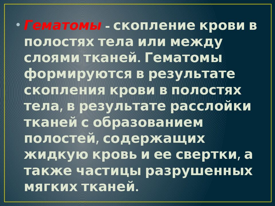 Гематомы - скопление крови в полостях тела или между слоями тканей. Гематомы формируются в результате скопления крови в полостях тела, в результате расслойки тканей с образованием полостей, содержащих жидкую кровь и ее свертки, а также частицы разрушенных мягких тканей.