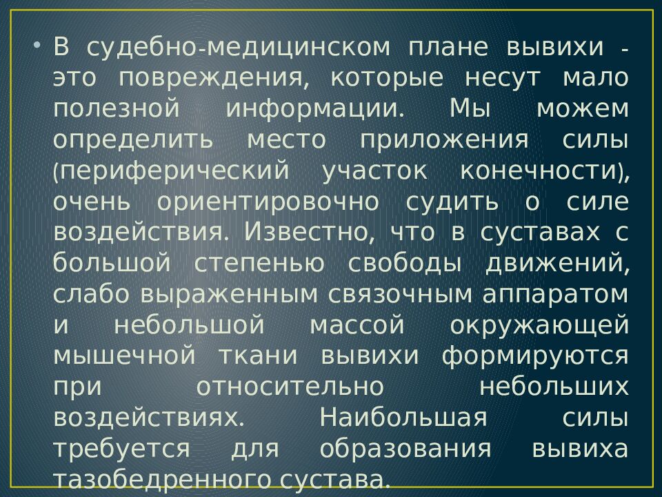 В судебно-медицинском плане вывихи - это повреждения, которые несут мало полезной информации. Мы можем определить место приложения силы (периферический участок конечности), очень ориентировочно судить о силе воздействия. Известно, что в суставах с большой степенью свободы движений, слабо выраженным связочным аппаратом и небольшой массой окружающей мышечной ткани вывихи формируются при относительно небольших воздействиях. Наибольшая силы требуется для образования вывиха тазобедренного сустава.