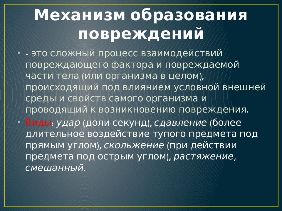- это сложный процесс взаимодействий повреждающего фактора и повреждаемой части тела (или организма в целом), происходящий под влиянием условной внешней среды и свойств самого организма и проводящий к возникновению повреждения. Виды : удар (доли секунд), сдавление (более длительное воздействие тупого предмета под прямым углом), скольжение (при действии предмета под острым углом), растяжение, смешанный.