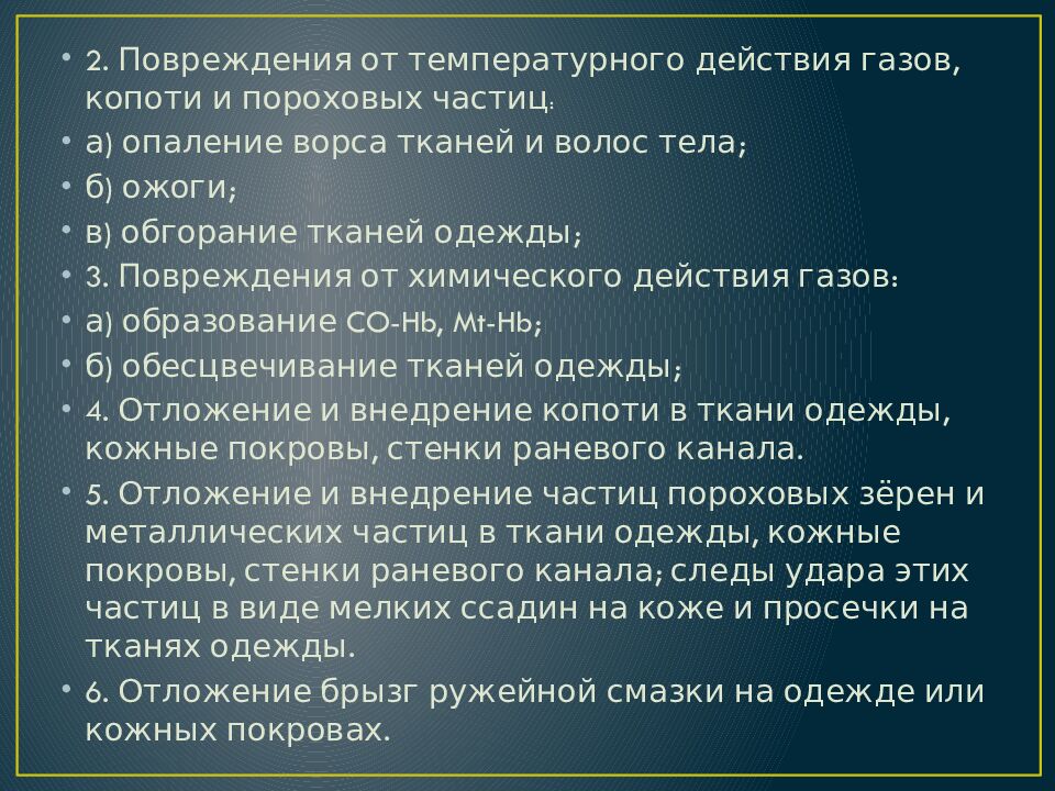 2. Повреждения от температурного действия газов, копоти и пороховых частиц : а) опаление ворса тканей и волос тела; б) ожоги; в) обгорание тканей одежды; 3. Повреждения от химического действия газов: а) образование CO-Hb, Mt-Hb ; б) обесцвечивание тканей одежды; 4. Отложение и внедрение копоти в ткани одежды, кожные покровы, стенки раневого канала. 5. Отложение и внедрение частиц пороховых зёрен и металлических частиц в ткани одежды, кожные покровы, стенки раневого канала; следы удара этих частиц в виде мелких ссадин на коже и просечки на тканях одежды. 6. Отложение брызг ружейной смазки на одежде или кожных покровах.