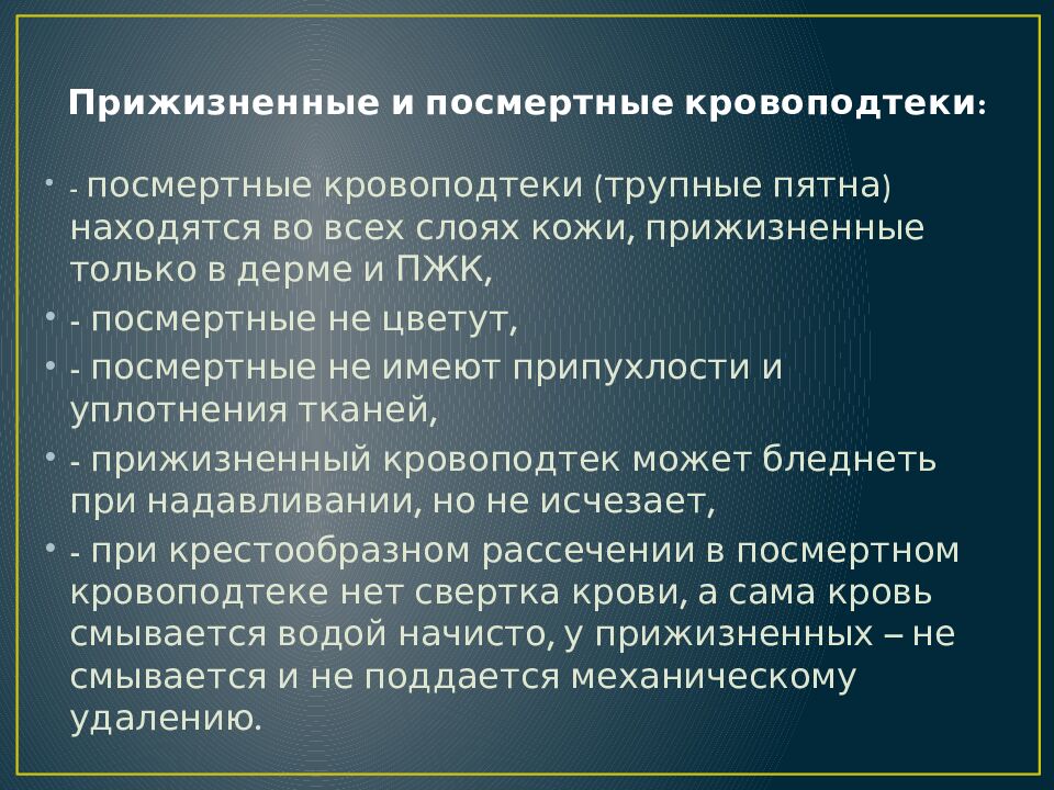 - посмертные кровоподтеки (трупные пятна) находятся во всех слоях кожи, прижизненные только в дерме и ПЖК, - посмертные не цветут, - посмертные не имеют припухлости и уплотнения тканей, - прижизненный кровоподтек может бледнеть при надавливании, но не исчезает, - при крестообразном рассечении в посмертном кровоподтеке нет свертка крови, а сама кровь смывается водой начисто, у прижизненных – не смывается и не поддается механическому удалению.