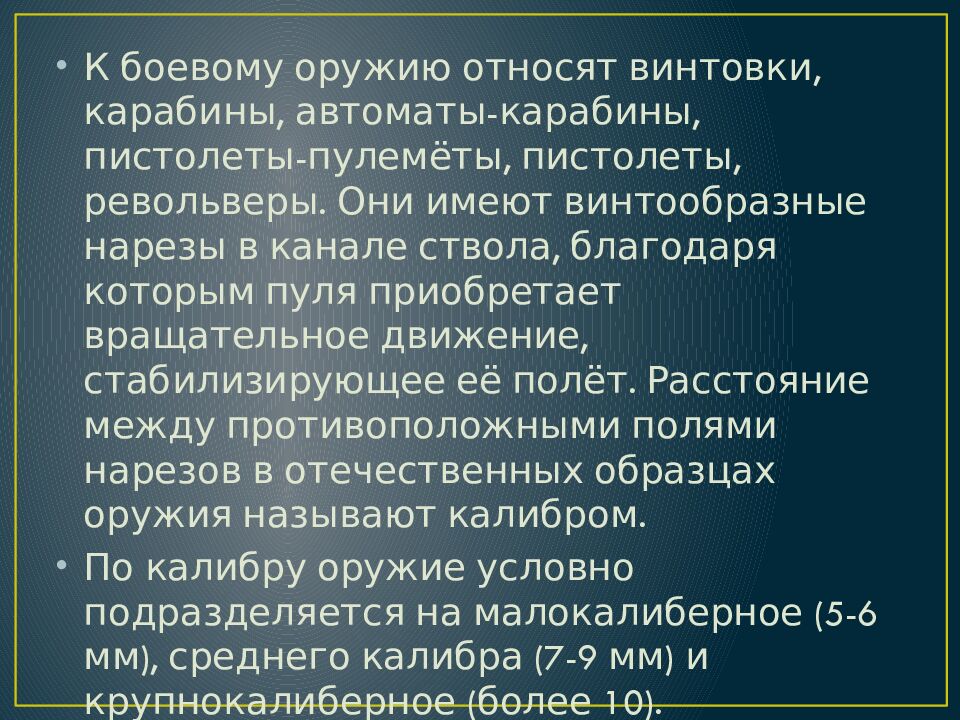 К боевому оружию относят винтовки, карабины, автоматы-карабины, пистолеты-пулемёты, пистолеты, револьверы. Они имеют винтообразные нарезы в канале ствола, благодаря которым пуля приобретает вращательное движение, стабилизирующее её полёт. Расстояние между противоположными полями нарезов в отечественных образцах оружия называют калибром. По калибру оружие условно подразделяется на малокалиберное (5-6 мм), среднего калибра (7-9 мм) и крупнокалиберное (более 10).