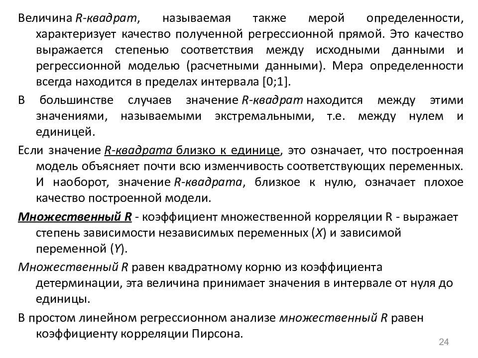 Величина R-квадрат, называемая также мерой определенности, характеризует качество полученной регрессионной прямой. Это качество выражается степенью соответствия между исходными данными и регрессионной моделью (расчетными данными). Мера определенности всегда находится в пределах интервала [0;1]. В большинстве случаев значение R-квадрат находится между этими значениями, называемыми экстремальными, т.е. между нулем и единицей. Если значение R-квадрата близко к единице, это означает, что построенная модель объясняет почти всю изменчивость соответствующих переменных. И наоборот, значение R-квадрата, близкое к нулю, означает плохое качество построенной модели. Множественный R - коэффициент множественной корреляции R - выражает степень зависимости независимых переменных ( X ) и зависимой переменной ( Y ). Множественный R равен квадратному корню из коэффициента детерминации, эта величина принимает значения в интервале от нуля до единицы. В простом линейном регрессионном анализе множественный R равен коэффициенту корреляции Пирсона. 24