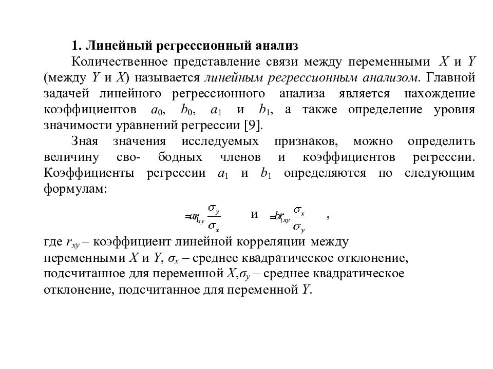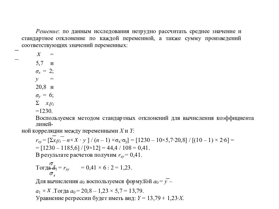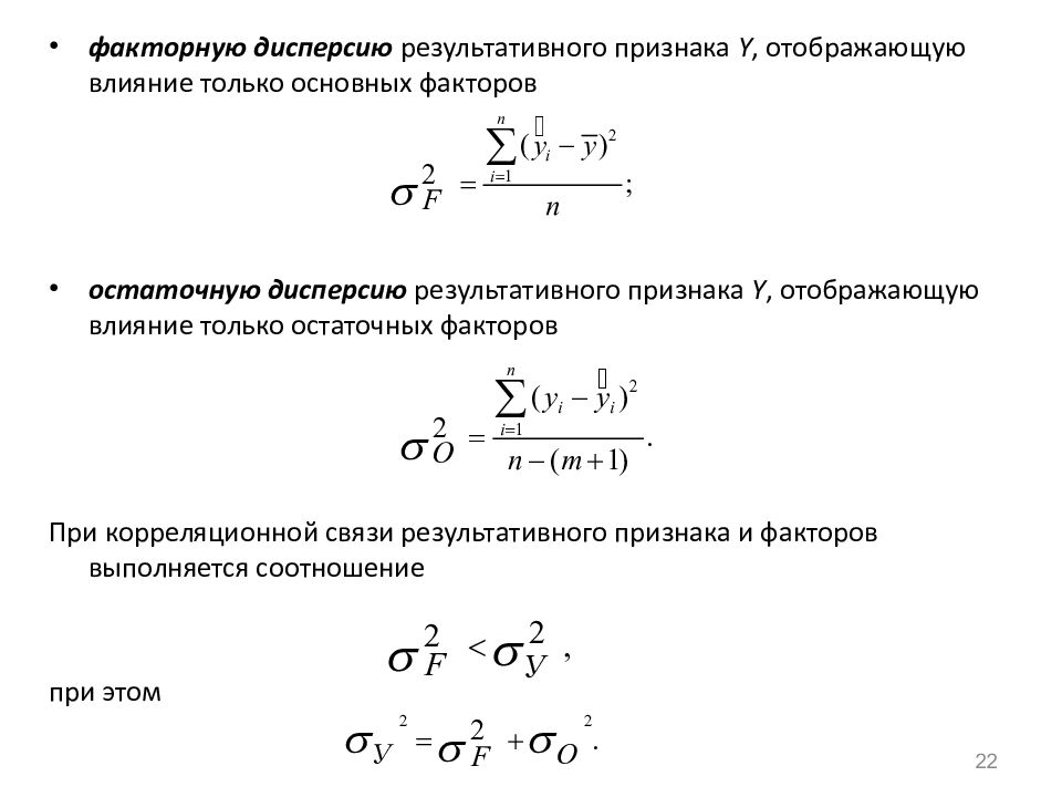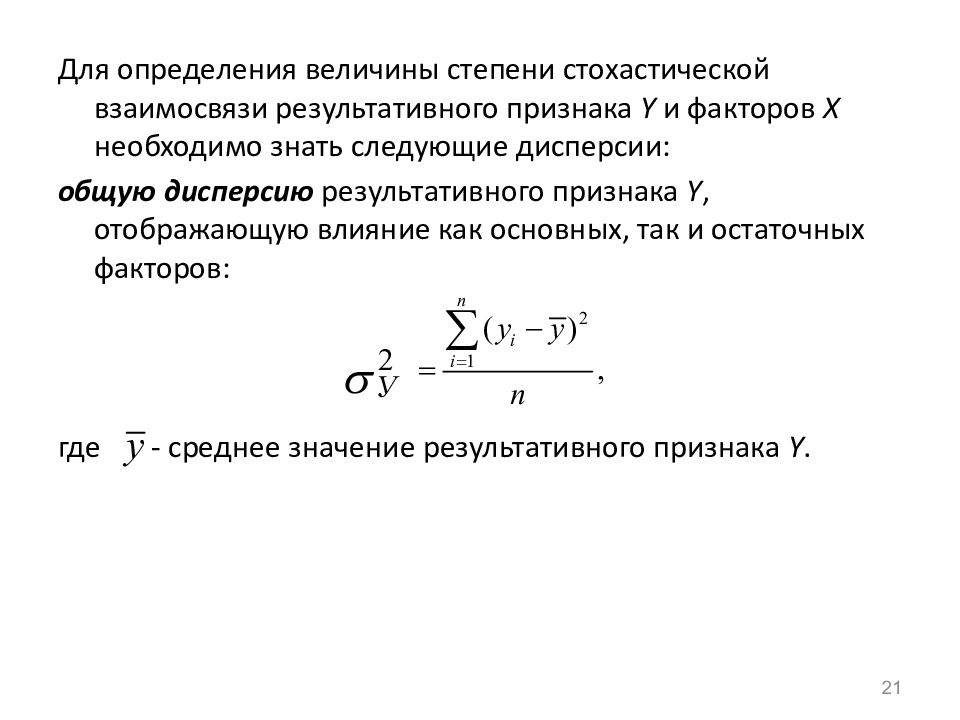 Для определения величины степени стохастической взаимосвязи результативного признака Y и факторов Х необходимо знать следующие дисперсии: общую дисперсию результативного признака Y, отображающую влияние как основных, так и остаточных факторов: где - среднее значение результативного признака Y. 21